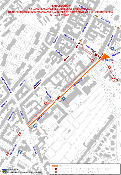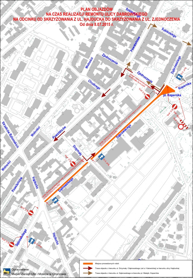Roboty prowadzone są w ciągu ul. Dąbrowskiego na odcinku od skrzyżowania z ul. Hajducką do skrzyżowania z ul. Zjednoczenia/pl. Kopernika na pasie ruchu prowadzącym w kierunku ul. Katowickiej. Ruch pojazdów na tym odcinku odbywa się jednokierunkowo od skrzyżowania z ul. Hajducką do skrzyżowania z ul. Zjednoczenia.