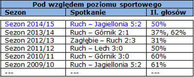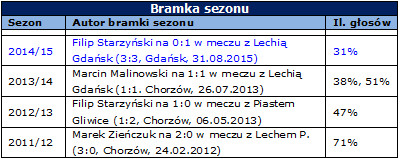 31% głosów). W sezonie 2013/14 gol strzelony w 100-tnych WDŚ uplasował się na drugiej pozycji. W składzie nie ma już popularnego "Figo", nie ma też "Maliny". Pozostał Marek Zieńciuk, który o ten tytuł zmierzy się zapewne z naszymi napastnikami, ale też zawodnikami występującymi w linii pomocy oraz obrony.