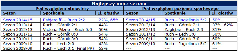 Nie można powiedzieć, że to był rok stracony. Grając w Gliwicach upewniliśmy się w przekonaniu, że kompaktowy, krojony na miarę stadion będzie dla nas idealnym. Dodatkowo przeżyliśmy europejską przygodę omal nie kwalifikując się do fazy grupowej Ligi Europy. Ciekawe jak wówczas potoczyłyby się losy Ruchu? Widzieliśmy kilka ciekawych bramek, a rywalizacją w Ekstraklasie emocjonowaliśmy się do samego końca. Sezon 2014/15 już za nami, choć można też powiedzieć, że pozostał w głowach działaczy, piłkarzy, którzy z niego mogą czerpać cenne doświadczenie.