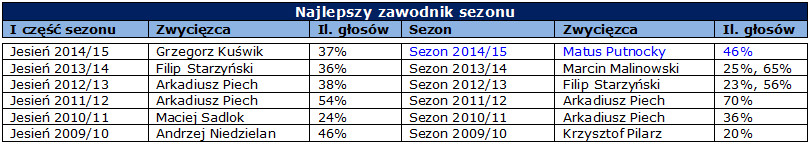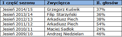 To już drugi raz kiedy golkiper zostaje najbardziej wartościowym zawodnikiem całego sezonu. Poprzednio ta sztuka udała się Krzysztofowi Pilarzowi. Było to jednak 6 lat temu. Tylko raz ten sam zawodnik będąc najlepszym jesienią, został też wybrany najlepszym w całym sezonie. Sezon 2011/12 należał w całości do Arka Piecha, który dzierży zresztą jeszcze jeden rekord - najlepszym zawodnikiem kolejnych głosowań zostawał cztery razy z rzędu.