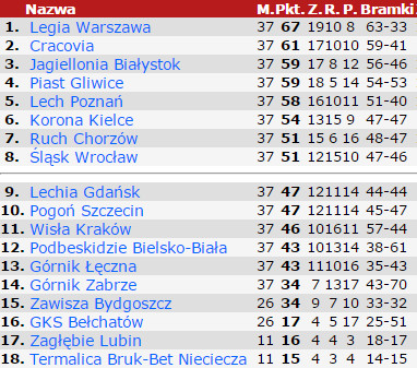 Piłkarze Ruchu rozegrali 37 ligowych kolejek, w których odnotowali 15 zwycięstw, 6 remisów i 16 porażek. 51 punktów plasuje chorzowian na 7. miejscu wśród 18 drużyn. Na podium znajdują się Legia Warszawa, Cracovia i Jagiellonia Białystok, zaś tabelę zamykają spadkowicze z poprzedniego sezonu i aktualni beniaminkowie. Spośród zespołów mających na koncie 37 meczów najsłabsze rezultaty osiągnęły: Górnik Zabrze, Górnik Łęczna i Podbeskidzie Bielsko-Biała.