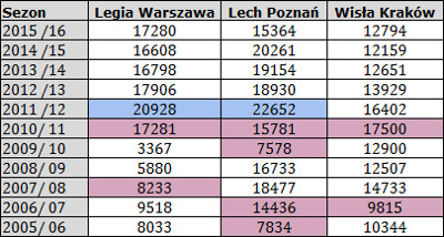 Jeszcze nie tak dawno Wisła wiodła prym w walce o mistrzostwo Polski, a dziś takimi zespołami są Legia i Lech. Ten fakt, ale i w konsekwencji spotkania rozgrywane o wysoką stawkę, oddziaływają niczym magnes. Oba kluby mają silne regiony, to jest Mazowsze i Wielkopolskę, praktycznie całe dla siebie. Toczą rywalizacją na boisku, zaskakują transferami, ale też prześcigają się na polu działań marketingowych. Lech już dawno przekroczył liczbę 1000 produktów w sklepie kibica, Legia zaś mierzy się z liczbą 10000 koszulek, które chce sprzedać w tym sezonie. Gdzie zatem jak nie na tak urodzajnym gruncie, frekwencja miałaby bardziej poszybować w górę?