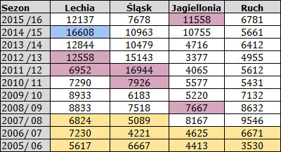 Po drodze wydarzyło się dużo korzystnych rzeczy, o których już wspominaliśmy: nowe stadiony, organizacja Euro 2012 oraz wzrost polskiej gospodarki, najlepiej mierzony PKB oraz rosnącą minimalną i średnią płacą. Frekwencja wzrosła w przeciągu pierwszych sześciu lat, po Euro nieco opadła stabilizując się na poziomie
