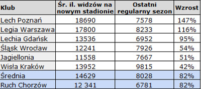 Tabela nr 3 pokazuje średnią frekwencję wybranych klubów od początku zagoszczenia na nowych obiektach. Wyliczenia zostały oparte na tabelach nr 1 i nr 2. W przypadku Ruchu obecna frekwencja została pomnożona przez średnio uzyskany wzrost.