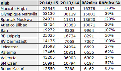 Tabela przedstawia rekordowe wzrosty ilości widzów w sezonie 2014/15 (TOP 12). Źródło: http://stadiony.net/publikacje/raporty/ranking_10_2015_frekwencje_w_europie_cz_2_kluby