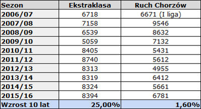 Tabela przedstawia średnią frekwencję na stadionach Ekstraklasy od sezony 2006/2007. Wówczas Ruch Chorzów grał jeszcze w I lidze.