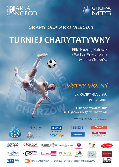 Charytatywny Turniej Piłki Nożnej Halowej o Puchar Prezydenta Miasta Chorzów odbędzie się w hali MORiS-u przy ul. Dąbrowskiego 113 w niedzielę 24 kwietnia. Rozpoczęcie zaplanowano na godz. 9:00, natomiast zakończenie na godz. 15:00. Zapraszamy do pojawienia się na turnieju i wsparcia szczytnej inicjatywy! Wstęp wolny!