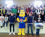 Jakub Wagner, Łukasz Siedlik i maskotka drużyny "Adler" odwiedzili uczniów Publicznej Szkoły Podstawowej nr 1 w Kaletach.