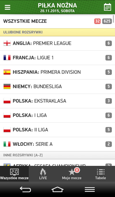 Dolna cześć głównej strony przedstawia przegląd wszystkich meczów dnia dzisiejszego (WSZYSTKIE MECZE), aktualnie rozgrywanych meczów (LIVE), listę meczów, które oznaczyliśmy ikonka gwiazdki jako ulubione (MOJE MECZE) - jest to, tak na marginesie, znakomita funkcja... oraz tabele wszystkich dostępnych w ramach wybranej dyscypliny (TABELE).