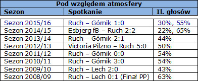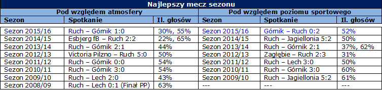 W każdym sezonie nie trudno wyróżnić spotkania, które dostarczyły nam wiele radości oraz emocji. My dzielimy je na te, w których podobała nam się gra oraz te podczas których panowała świetna atmosfera na trybunach. Zdarza się, że gra idzie w parze z dopingiem jak miało to miejsce w sezonie 2010/11, kiedy to przy Cichej gasły światła, a po ich włączeniu Niebiescy zaaplikowali rywalom z Zabrza aż trzy gole.