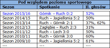 Mecze derbowe cieszą się niezwykłą popularnością i panuje na nich wyjątkowa atmosfera. Jeżeli dodatkowo okraszone są pięknymi golami oraz cennym zwycięstwem, to trudno o inny mecz, który będzie w stanie podjąć rywalizacje w naszej zabawie. W minionym sezonie dwukrotnie pokonaliśmy zabrzańskiego Górnika. Cenne 1:0 u siebie i świetna zabawa na trybunach sprawiły, że po raz czwarty WDŚ zostały wybrane najlepszym spotkaniem pod względem atmosfery. Nie mniej smakowało nam zwycięstwo w Zabrzu, dodatkowo na otwarcie nowego obiektu. Dwie bramki zaaplikowane rywalom sprawiły, że nie mogło być żadnych wątpliwości na polu wyróżnienia piłkarzy za najlepszą grę.