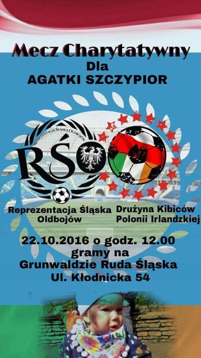 Reprezentacja Śląska Oldbojów oraz Drużyna Kibiców Polonii Irlandzkiej rozegrają razem mecz charytatywny dla Agatki Szczypior, córki Dawida, który kilka lat temu był piłkarzem Ruchu Chorzów.