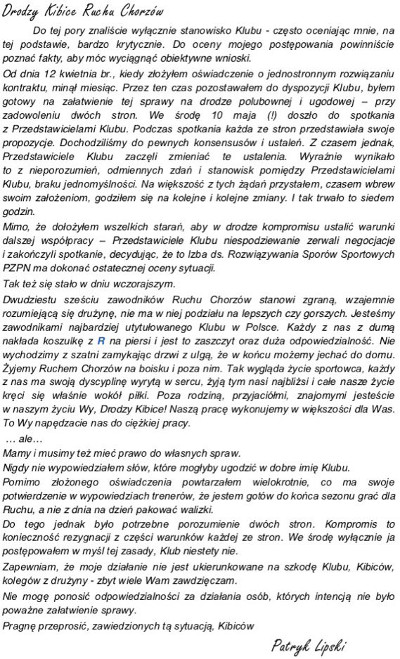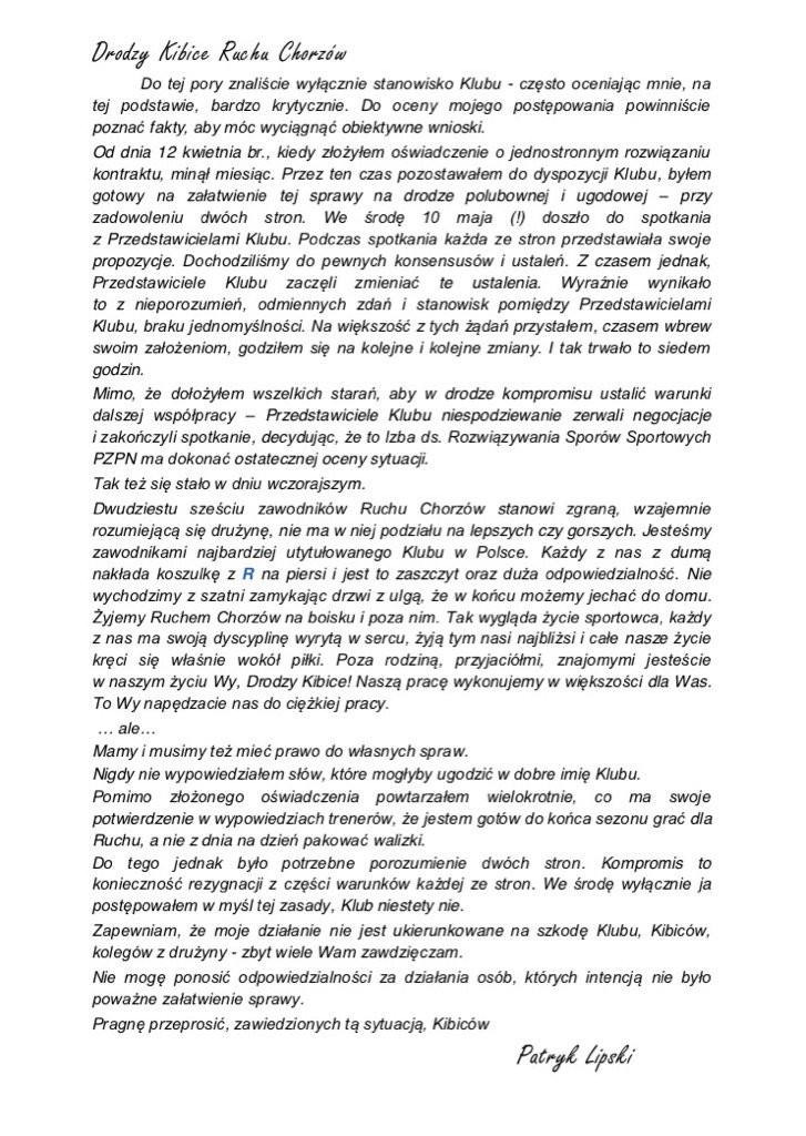 Patryk Lipski wydał oświadczenie, w którym zwrócił się do kibiców Ruchu Chorzów. Niespełna 23-letni zawodnik opisał kulisy swojego rozstania z klubem z ulicy Cichej 6.