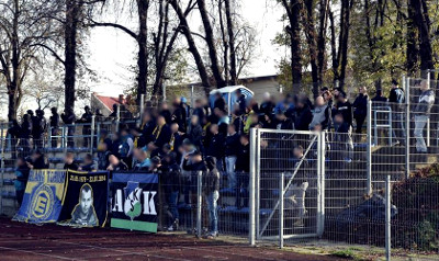 Na stadion Centry, jak to najczęściej na naszych wyjazdach bywa (niezależnie od tego ile wcześniej byśmy wyjechali), znowu się delikatnie spóźniamy i około 10 minuty wchodzimy do klatki gości. Zaraz po nas bez żadnej obstawy konkretną załogą w silę