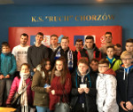 Uczniowie rozpoczęli zwiedzanie stadionu od wejścia na trybunę górną, gdzie poznali sylwetki najwybitniejszych piłkarzy Ruchu i usłyszeli najważniejsze fakty z dziejów 14-krotnego Mistrza Polski. Następnie goście udali się do kultowej kawiarenki klubowej, gdzie dowiedzieli się, jakie znaczenie miało to miejsce w historii klubu oraz do czego służy obecnie. Zobaczyli także znajdujące się tam puchary i inne trofea, jakie Ruch wywalczył przez prawie 98 lat swojego istnienia. Młodzież obejrzała także szatnie naszych piłkarzy, a na zakończenie spotkała się z zawodnikami, którzy przyjechali do nich prosto z badań wydolnościowych. Michał Rutkowski, Adam Setla, Mateusz Hołownia i Kamil Słoma rozdali uczniom autografy i wykonali sobie z nimi zdjęcia.