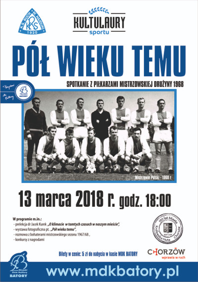 Spotkanie pod hasłem "Pół wieku temu" będzie kolejną imprezą z cyklu "Kultulaury sportu" i zostanie w całości poświęcone "złotej" drużynie Ruchu z 1968 roku. W programie, prócz spotkania z Mistrzami, znalazły się również prelekcja dra Jacka Kurka pt. "O klimacie w tamtych czasach w naszym mieście", wystawa fotograficzna pt. "Pół wieku temu", przygotowywana przez Andrzeja Godoja, a także konkursy z nagrodami. Obecność potwierdzili już m.in. Józef Bon, Eugeniusz Kulik, Eugeniusz Lerch, Antoni Nieroba, Antoni Piechniczek, Henryk Pietrek i Jan Rudnow, a także kolejne pokolenia piłkarzy Niebieskich. Imprezę poprowadzi dziennikarz "Sportu" Zbigniew Cieńciała.