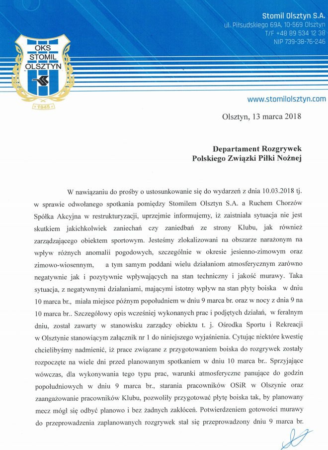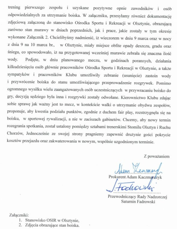 Stomil Olsztyn wydał w oświadczenie, w którym sugeruje między innymi rozegranie spotkania z Ruchem Chorzów w innym terminie. "Kierownictwo Klubu zdając sobie sprawę jak ważny jest to mecz, w kontekście walki o utrzymanie obydwu zespołów, proponuje, aby kwestia podziału punktów, zgodnie z duchem fair play, rozstrzygnęła się na boisku, w sportowej rywalizacji, a nie w zaciszach gabinetów" - czytamy w komunikacie.