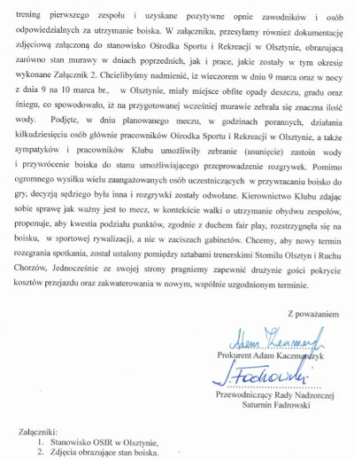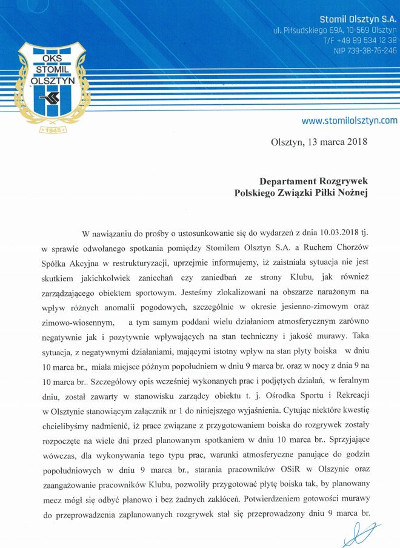 Klub z Warmii zapewnia ponadto, że pokryje koszty przejazdu drużyny Ruchu oraz zakwaterowania w nowym, wspólnie uzgodnionym terminie.