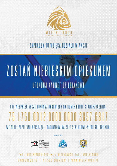 - Akcja "Niebieski Opiekun" była już przeprowadzana kilkukrotnie i za każdym razem kończyła się niemałym sukcesem - przypomina prezes Wielkiego Ruchu, Piotr Jarzębak. - Jest to pozytyw dla klubu, który pozyskuje nie tylko nowych kibiców, którzy poprzez swoją ciężką sytuację finansową nie mogli sobie pozwolić na odwiedziny na stadionie, ale też inwestuje w przyszłość. Młody kibic oglądający mecz na żywo, chłonący atmosferę meczową i całą otoczkę tego wydarzenia będzie z chęcią przychodził na Cichą w kolejnych latach - dodaje.