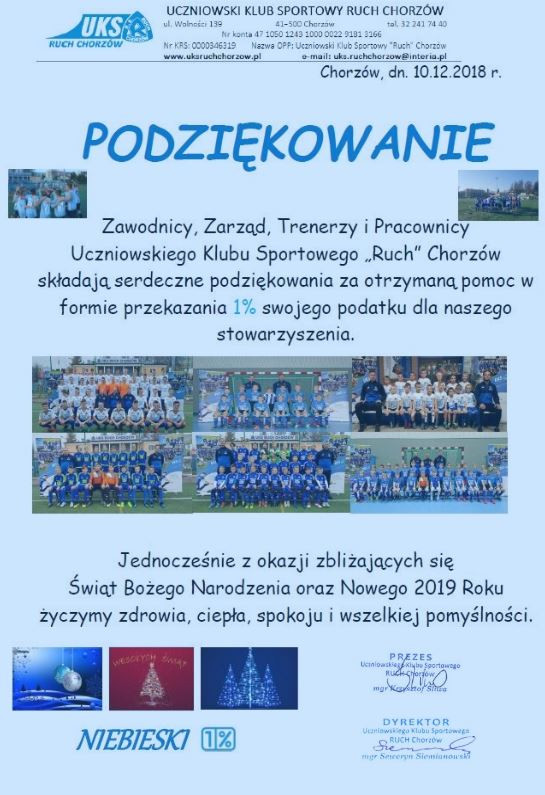 Prezentujemy podziękowania, które nadesłał do naszej redakcji Uczniowski Klub Sportowy Ruch Chorzów. Zawodnicy, Zarząd, Trenerzy i Pracownicy UKS-u pragną podziękować za otrzymaną pomoc w formie przekazania 1% swojego podatku dla stowarzyszenia.