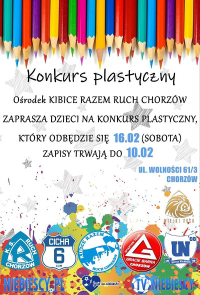 Wszystkie dzieci zapraszamy na konkurs plastyczny, który zostanie zorganizowany przez Kibice Razem Ruch Chorzów. Impreza odbędzie się w sobotę, 16 lutego, o godz. 10:00 w siedzibie ośrodka przy ul. Wolności 61/3.