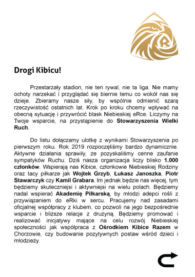Kibicom wchodzącym na mecz z Olimpią Grudziądz, przedstawiciele Stowarzyszenia Wielki Ruch będą wręczać ulotki oraz listy. Przygotowane one zostały w związku z akcją promocyjną mającą na celu wzrost ilości członków. Obserwujemy wzmożone działania WR w social mediach, teraz przyszedł czas powrotu na Cichą. Do osiągnięcia liczby 1.000 członków brakuje już tylko 100 osób.