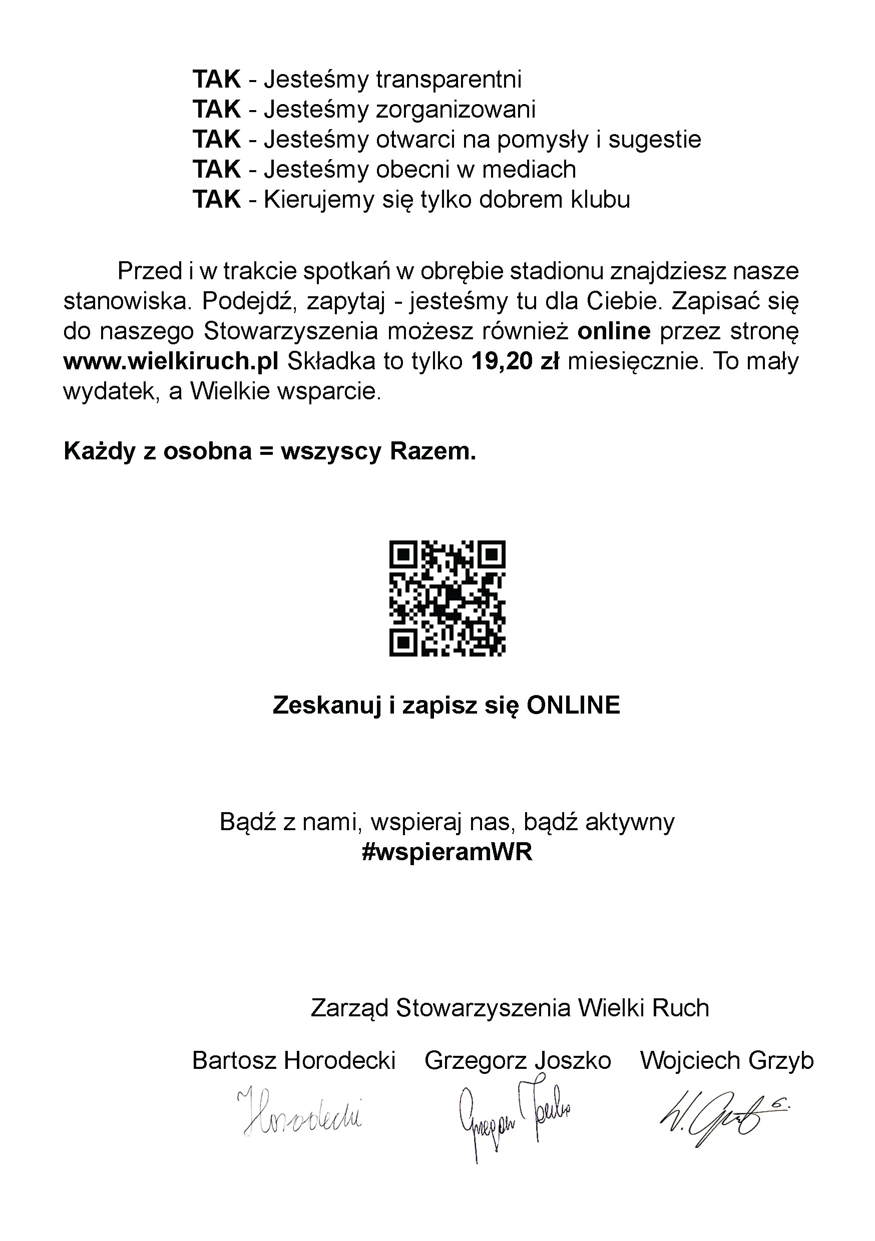 Treść listu znajdziecie poniżej. W momencie zainicjowania akcji #wspieramWR (17 lutego) do Stowarzyszenia należało 312 członków. Mamy zatem szansę potroić ten wynik na przestrzeni niecałego miesiąca. Zależy to od naszego zaangażowania i wspólnego działania, dlatego w niedzielę wszyscy bądźmy woluntariuszami Wielkiego Ruchu! Zachęćmy niezdecydowanych oraz tych, którzy o działaniach Stowarzyszenia za dużo nie słyszeli. Ulotka i list z pewnością będą bardzo przydatne.