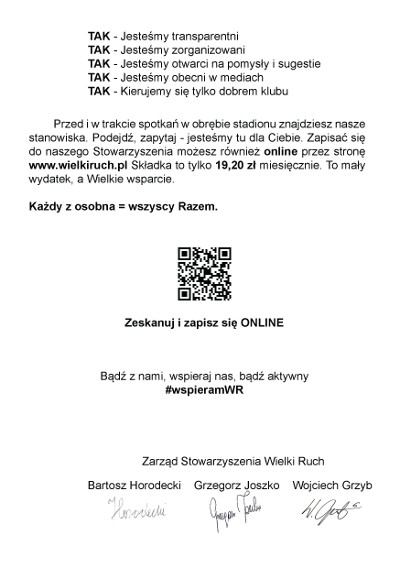 Zapisywać się można na stanowiskach, w formie online, czy po zeskanowaniu specjalnego kodu QR. Wierzymy, że to będzie rekordowy mecz pod względem naboru do Wielkiego Ruchu oraz, a próg 1.000 członków nie tylko “pęknie”, ale zostanie znacznie przekroczony.