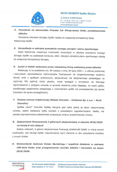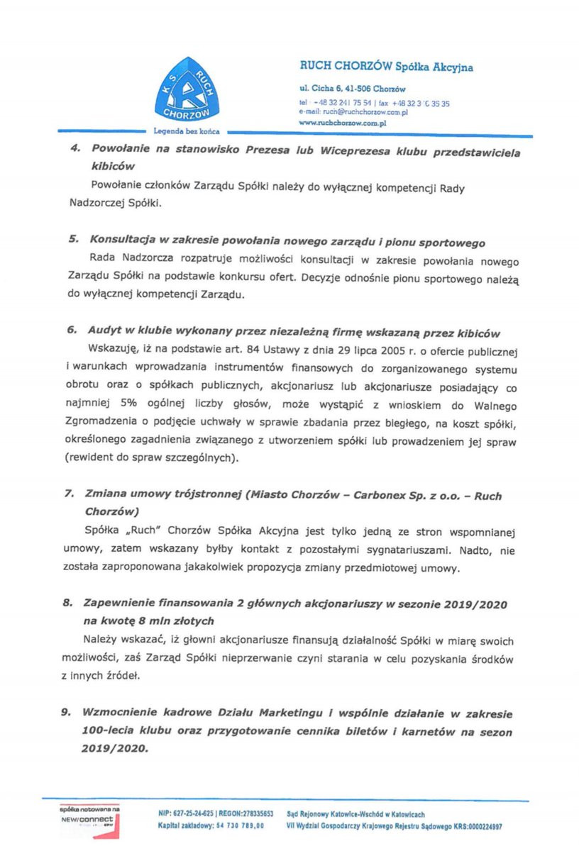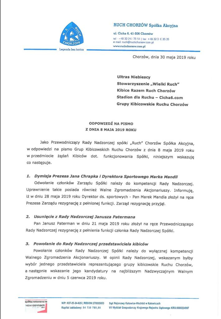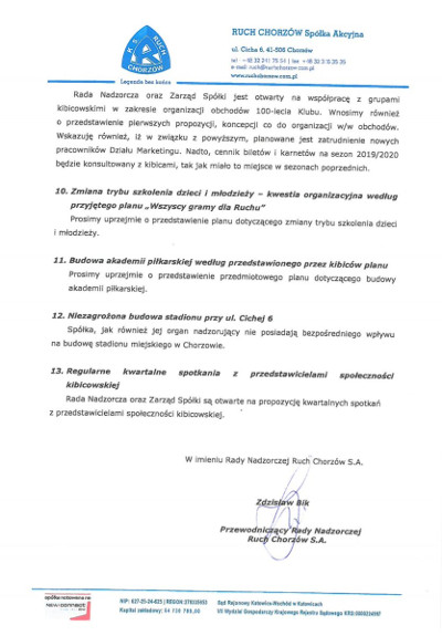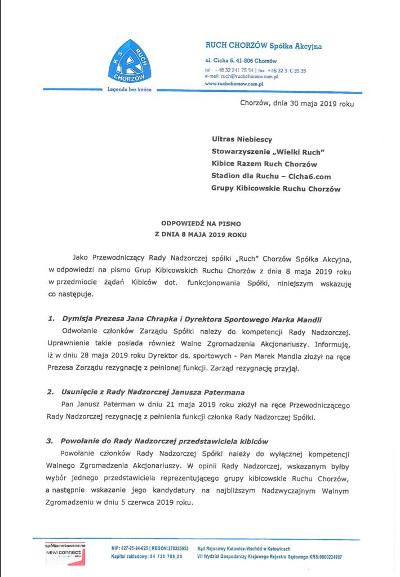 Rada Nadzorcza Ruchu Chorzów odpowiedziała na żądania kibiców Niebieskich. Pod pismem przesłanym do Stowarzyszenia Wielki Ruch podpisał się przewodniczący Zdzisław Bik.