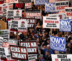 Prezentujemy naszą trzecią fotogalerię z manifestacji kibiców w sprawie nowego stadionu dla Ruchu Chorzów. Fani Niebieskich mieli ze sobą mnóstwo transparentów, a także... trumnę.