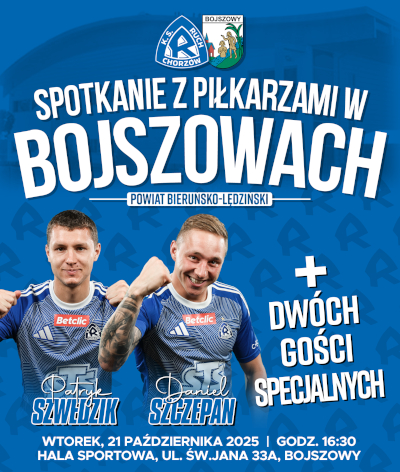 Daniel Szczepan i Patryk Szwedzik odwiedzą w najbliższy wtorek Bojszowy. Zapraszamy na otwarte spotkanie z piłkarzami Niebieskich, które zacznie się o 16:30 w hali sportowej przy ul. św. Jana 33A.