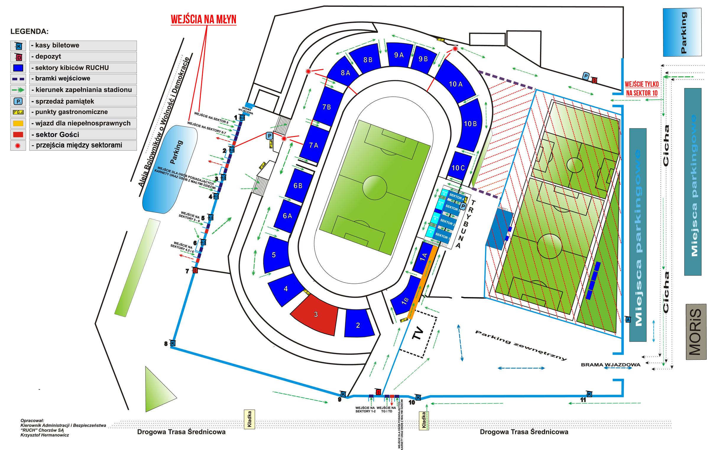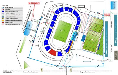 Wejście na młyn (sektory nr 8 i 9) będzie możliwe tylko od strony al. Bojowników (dwie pierwsze bramki od strony hotelu).