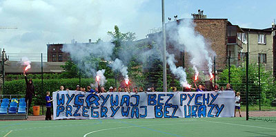 do tego widowiskową oprawę, na którą składał się transparent „Wygrywaj bez pychy, przegrywaj bez urazy” oraz race.