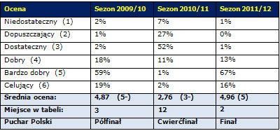 Do tej pory najwyższą notę przyznaliście za udział w rozgrywkach 2009/10. W porównaniu do tamtego czasu "Niebiescy" zajęli jedną lokatę wyżej w tabeli i o szczebel dalej dotarli w rozgrywkach Pucharu Polski. Oceniając sezon zapewne brane są pod uwagę także inne czynniki jak na przykład wysokość budżetu.