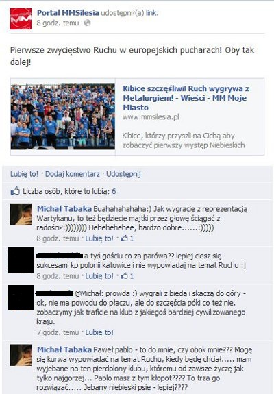 Michał Tabaka - wdając się w dyskusję na Facebooku po czwartkowej wygranej Ruchu nad Metalurgiem Skopje. Choć czynił to w czasie wolnym, to najwyraźniej zapomniał, gdzie pracuje.