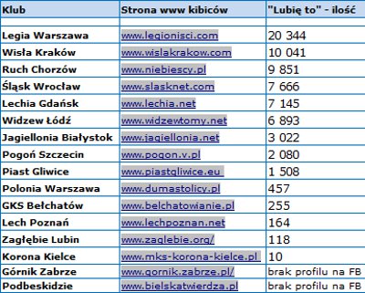 Uważnie śledzący nasz serwis pewnie zauważyli, że ilość osób "lubiących nas" zbliża się powoli do 10.000. My przy tej okazji przygotowaliśmy zestawienie jak wygląda na tym polu nasza konkurencja, czyli strony prowadzone przez kibiców pozostałych dużych Ekstraklasy.