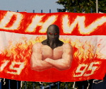 flagi: "Psycho Fans", "DHW" (Widzewa), "Łódzki Widzew & Chorzowski Ruch", "Oberschlesien", "Ruch Chorzów", "To My Naród Śląski", herb, "Wielkie Hajduki", "Zawiercie", "Radlin", "Kęty" oraz mała fanka Atletico Madryt.