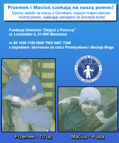 Dziękujemy działaczom Ruchu Chorzów SSA za pomoc w uzyskaniu licencji od Ekstraklasy S.A. i Canal + na wyemitowanie derbowego meczu, a przede wszystkim za pokrycie kosztów związanych z wynajęciem telebimu. Dzięki temu wszystkie uzbierane przez nas pieniądze będziemy mogli przekazać na rehabilitację Przemka i Maciusia.