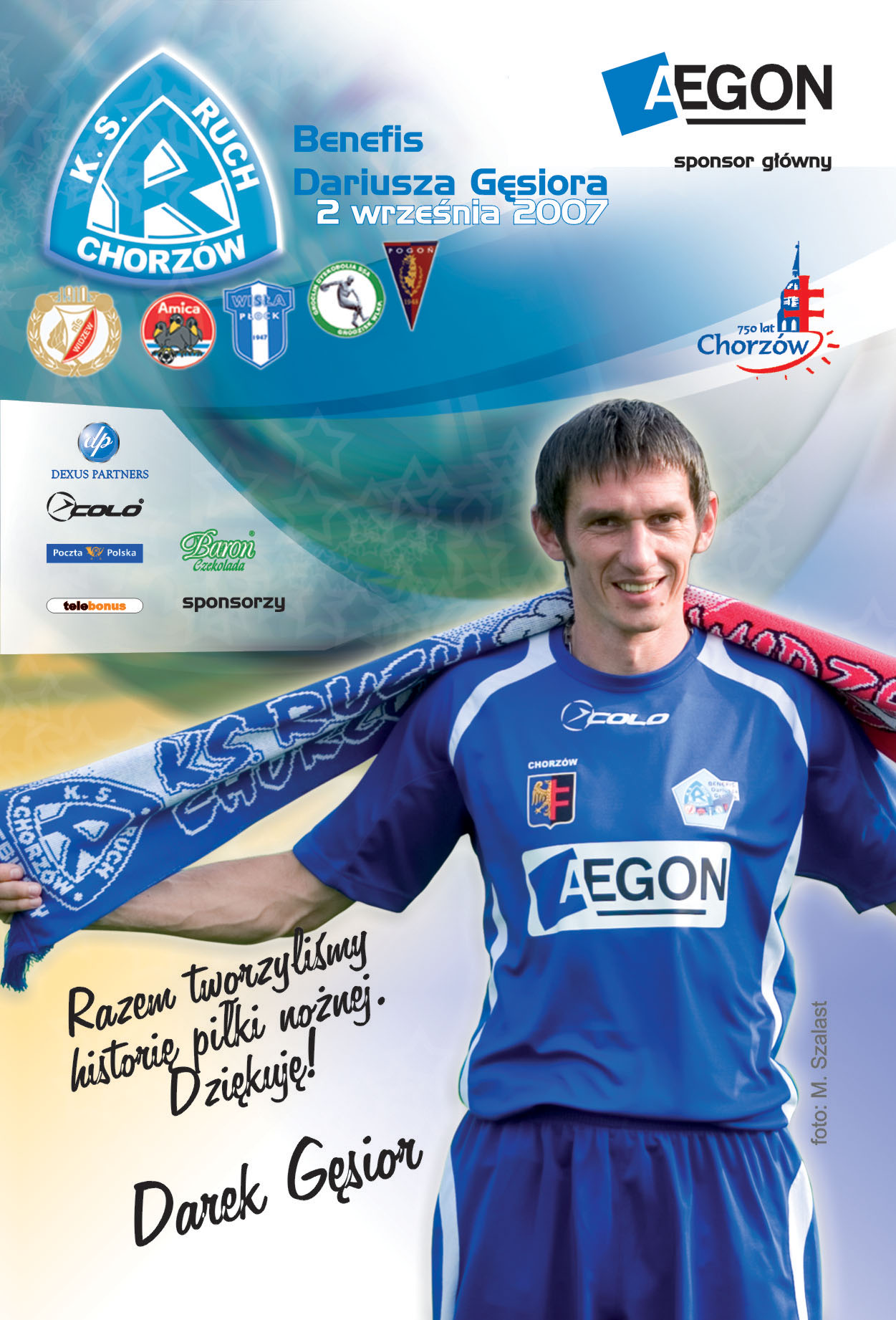 2. września (niedziela) na stadionie Ruchu Chorzów przy ul. Cichej 6 odbędzie się Benefis Dariusza Gęsiora. Ruszyła sprzedaż biletów na tą imprezę. Wejściówki można nabywać od poniedziałku do piątku w godz. 8:00 - 15:00 na pierwszym piętrze hali MORiS (przy ul. Dąbrowskiego 113 w Chorzowie - obok obiektu, na którym swoje mecze rozgrywa Ruch).