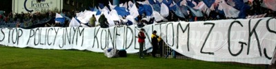 Mecz Ruchu z Bełchatowem nie powinien się w ogóle rozpocząć, dopóki ten transparent wisiał na trybunach. Dla klimatów więzienno-kryminalnych na stadionach nie może być miejsca, podobnie jak nie może być go dla chuligaństwa, wandalizmu i agresji - nawet wulgaryzmy, pewnie nieuniknione, trzeba zepchnąć na margines.