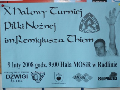 Kibice z Radlina już po raz 10. zorganizują halowy turniej sympatyków Ruchu, poświęcony pamięci tragicznie zmarłego Remigiusza Thiem. Impreza odbędzie się 9. lutego od godz. 9:00 w radlińskiej hali MOSIR, przy ul. Korfantego 17.