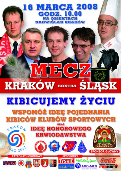 Już niedługo, bo w najbliższą niedzielę (16. marca) na stadionie Nadwiślan Kraków odbędzie się kolejna impreza sportowa oraz oddawanie krwi. Uroczyste rozpoczęcie zaplanowano na godzinę 10, a pół godziny później zostanie rozegrany mecz pomiędzy drużynami krakowskich krwiodawców, kibiców oraz działaczy KS Wieczysta, Wisły Kraków, Cracovii oraz Hutnika a reprezentacją sympatyków Ruchu Chorzów, której trzonem będą zaprzyjaźnieni piłkarze firmy ADO-MED w Świętochłowicach. Kapitanem drużyny krakowskiej będzie Prezes Cracovia Pasy - Andrzej Tychoniak. Zespół Błękitnej Krwi poprowadzi natomiast Andrzej Carmann.