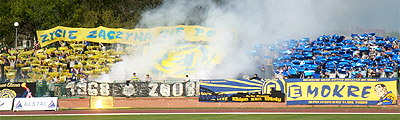 Elana Toruń: Torunianie w ten weekend podejmowali u siebie Kujawiaka Włocławek. Derbowe spotkanie zakończyło się bezbramkowym remisem. W młynie tego dnia zjawiło się 700 osób, a wśród nich 80 fanów Kujawiaka (fc Elany), 9 kibiców Widzewa z FC Grudziądz, 3 sympatyków Ruchu i 1 Jezioraka Iława. W pierwszej połowie kibice Elany zaprezentowali folię na płot (1968 (E) 2008) podświetloną ogniami wrocławskimi, nad nią na sektorze żółte i niebieskie sreberka oraz sektorówkę w kształcie herbu klubu, zaś na koronie stadionu transparent z napisem: "Życie zaczyna się po 40". Po przerwie w młynie została rozwinięta podłużna sektorówka, a także pojawiły się balony w barwach klubu. Kolejne spotkanie Elana rozegra w Gnieźnie 30. kwietnia o godz. 17:00.
