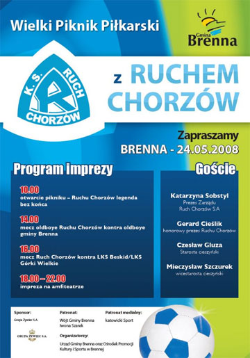 Festyn będzie doskonałą okazją do spędzenia wolnego czasu. Otwarcie imprezy zaplanowane jest na godzinę 10:00, ale na pierwsze piłkarskie atrakcje trzeba będzie poczekać do godziny 14. Wówczas na boisku spotkają się zespoły oldboyów Ruchu i gminy Brenna. Tuż po nich na murawie pojawią się główni bohaterowie widowiska, czyli aktualni piłkarze drużyny z Chorzowa. Ich rywalami będzie zespół złożony z graczy LKS Beskid i LKS Górki Wielkie.