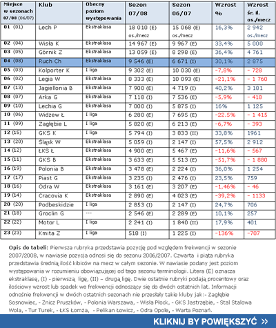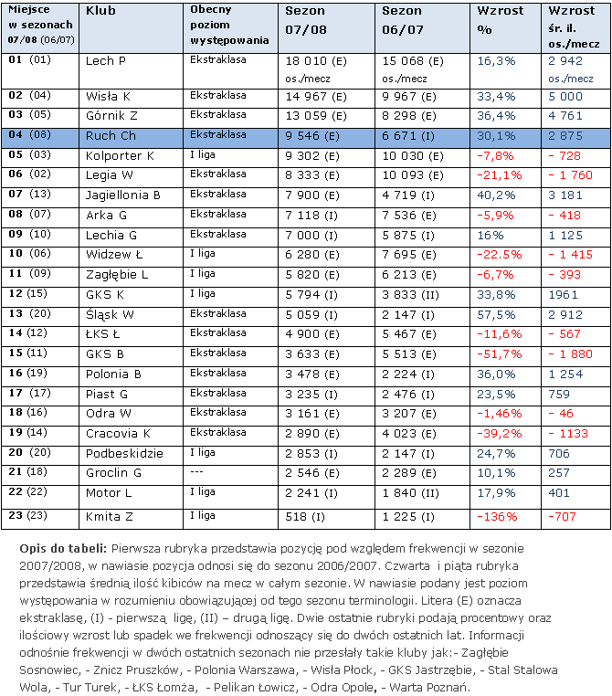 Ruch Chorzów, a właściwie jego kibice zajęli czwarte miejsce w klasyfikacji dotyczącej frekwencji w sezonie 2007/2008, z oglądalnością każdego meczu na poziomie 9546 widzów. Na ten wynik z całą pewnością duży wpływ miała organizacja Wielkich Derbów Śląska, a także mecze z Widzewem Łódź oraz Lechem Poznań, które oglądane były odpowiednio przez ok. 15 tys. i 13 tys. kibiców. Biorąc pod uwagę fakt, że osiągnęliśmy czwarte miejsce po czterech latach rozbratu z Ekstraklasą oraz uwzględniając 30% wzrost, to jest się z czego cieszyć. Należy też pamiętać, że początek zeszłego sezonu nie był łatwy. W meczu z Zagłębiem Sosnowiec najtańszy bilet kosztował 25 zł (podwyżka blisko o 70%), zaś w meczu z Kolporterem Kielce PZPN ograniczył ilość miejsc do sektora rodzinnego.