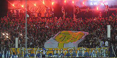 Mecz przyciągnął na stadion rekrodową frekwencję. Z akcentów ultras można jedynie odnotować próbę prezentacji kibiców Znicza. Lecz z powodu konfliktu z ochroną udało im się jedynie wywiesić trans "Tędy przeszła Warszawa".