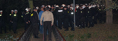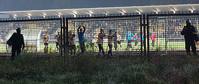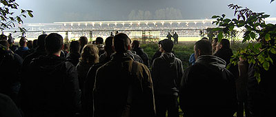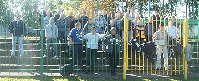 Sztuka ta udała się nielicznym. Ok. 50-osobowa grupa zasiadła między gospodarzami. W 30min wstała i oznajmiła wszystkim swoje stanowisko: tradycjne "Jesteśmy zawsze tam, gdzie Nasz Widzewek gra" oraz głośne "Piłka nożna dla kibiców". I przy konsternacji i totalnemu zaskoczeniu miejscowych opuściła obiekt solidaryzując się z blisko 300-osobową resztą fanów. Wszyscy udali się na drugą stronę stadionu, gdzie w parku, za rzeką przez płot spróbować obejrzeć mecz i dopingować swoją drużynę.
