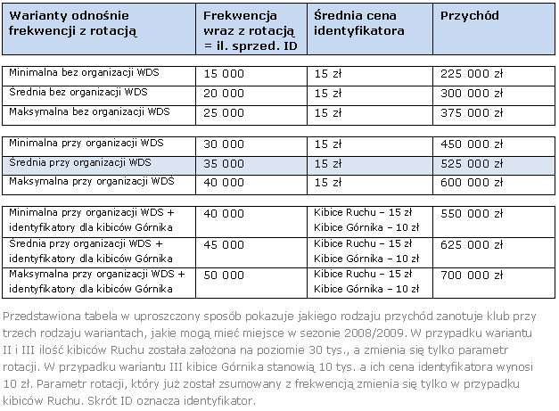 W tabeli kolorem niebieskim został zaznaczony najbardziej prawdopodobny scenariusz, czyli blisko 30 000 tys. kibiców Ruchu na WDŚ oraz ok. 5 tys. kibiców, którzy przyjdą zobaczyć dowolny inny mecz, a nie będą obecni na WDŚ. Suma jaka z tego tytułu wpłynie do budżetu jest iście zawrotna i wynosi ok. 525 tys. zł! Przypomnijmy, że w całym 2007 roku kibice zasili budżet klubu sumą 1,9 mln zł. Teraz na sprzedaży identyfikatorów klub miałby zarobić aż ¼ tej sumy! Innymi słowy to tak jakby Zarząd zorganizował w jednym sezonie dwukrotnie WDŚ, tylko że za drugim razem bez udziału kibiców, ale za to z ich pieniędzmi w budżecie!