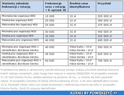 Drugi współczynnik umownie zostanie nazwany 'frekwencja z rotacją' i będzie tak naprawdę oznaczał ilość sprzedanych identyfikatorów. Sytuacja jest o tyle trudna, że jesteśmy w trakcie sezonu i nie jesteśmy w stanie powiedzieć, czy sukces związany z organizacją Wielkich Derbów Śląska zostanie powtórzony, a to zaś będzie miało duży wpływ na ostateczny rozrachunek. W związku z tym w symulacji finansowej zostaną założone trzy scenariusze. Pełen obraz powinna dać poniższa tabela.