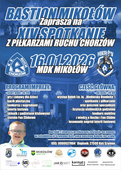 W trakcie spotkania zostanie przeprowadzona loteria i licytacje gadżetów. Dochód z tych akcji będzie przekazany jako pomoc na rehabilitację dla Szymona Kusia, syna kibica Ruchu z Mikołowa.